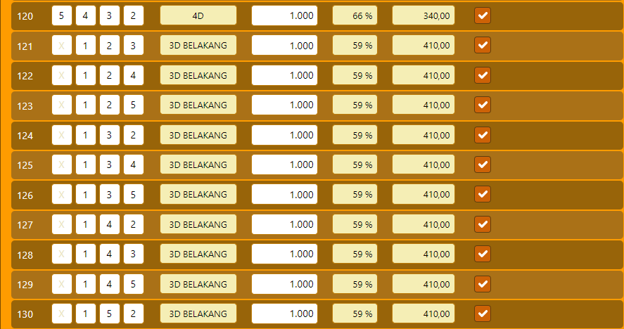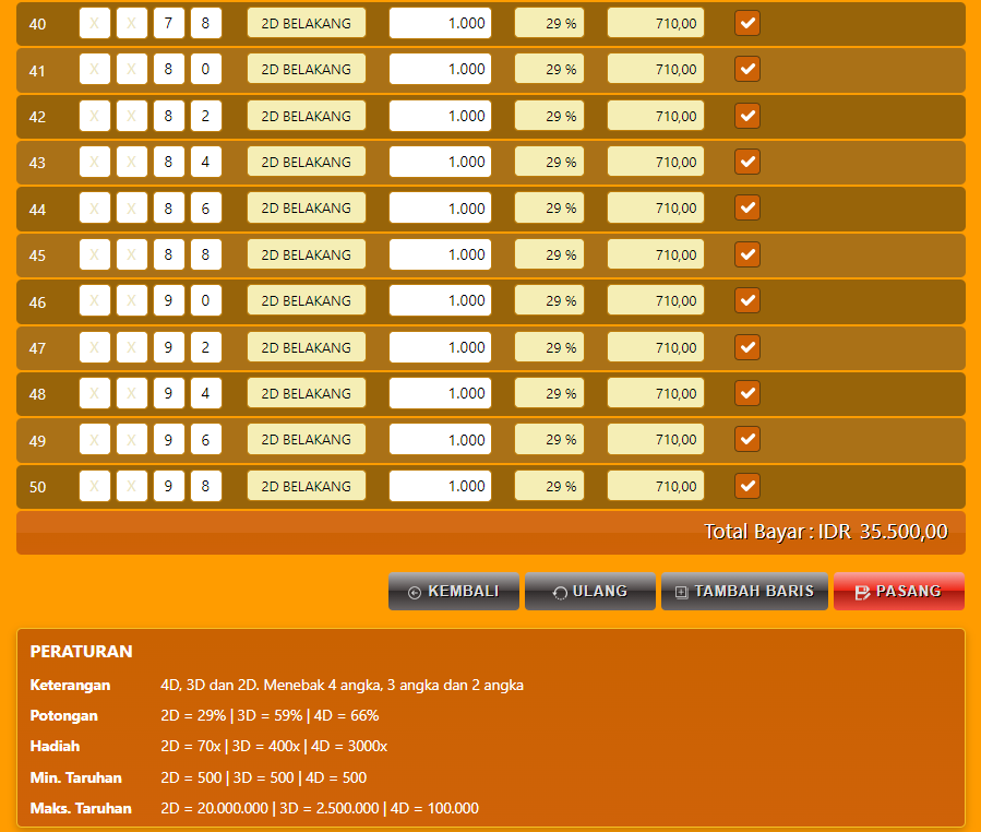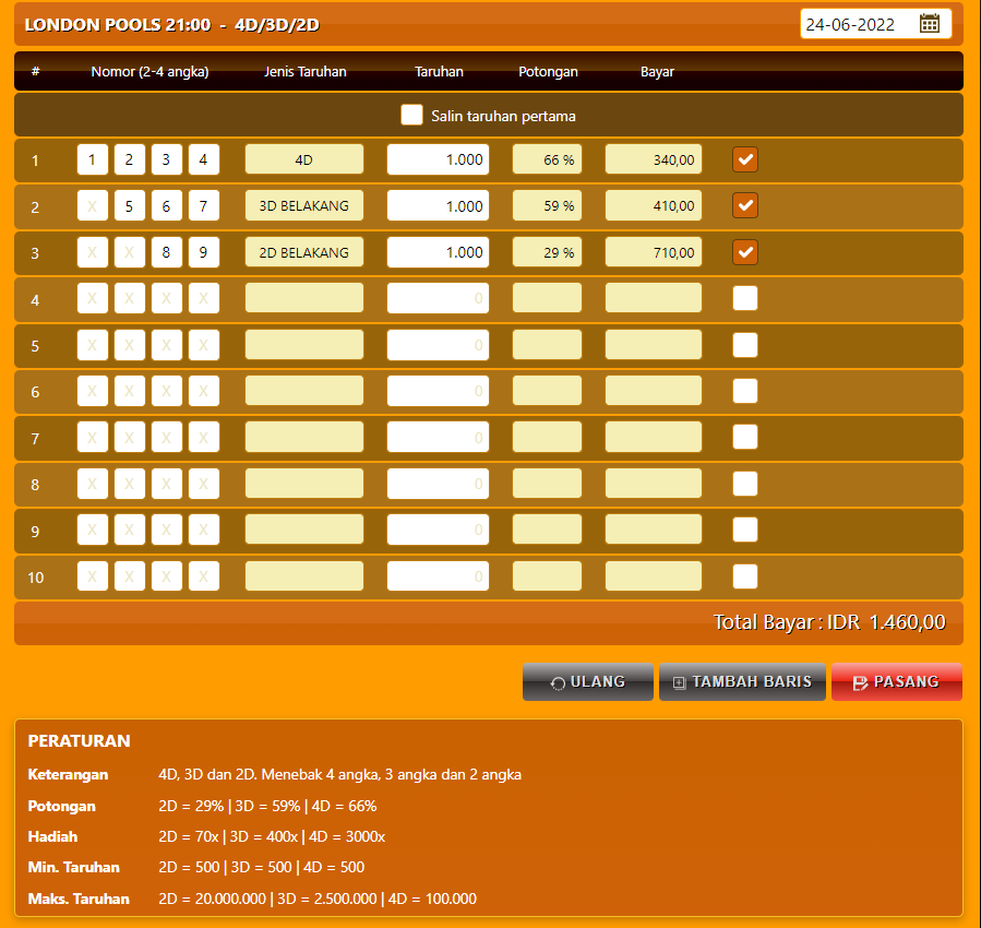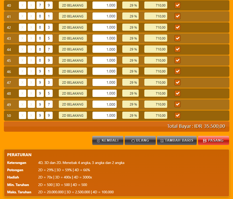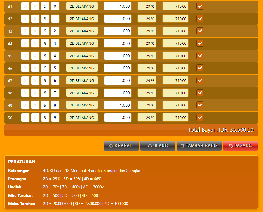Pilih salah satu pasangan angka 2D, 3D, atau 4D. dan juga bisa memilih semua taruhan (2D, 3D, dan 4D).