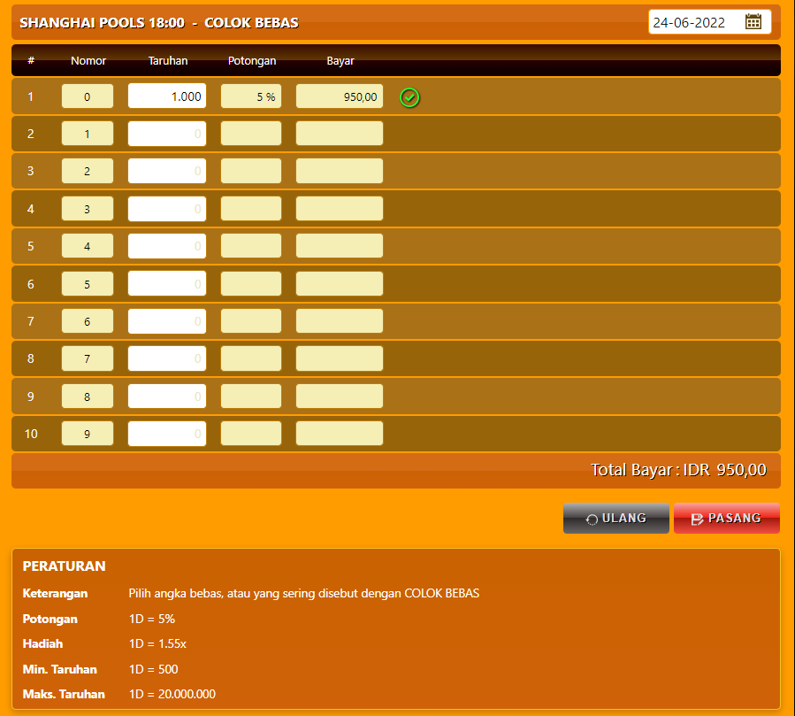 contoh : Anda memasang angka 0, keluar di jam 18:00 Dengan taruhan Rp1.000, mendapatkan potongan sebesar 5%. Jika nanti angka yang keluar adalah kombinasi 4D 2407, maka anda akan mendapatkan hadiah sebesar 1,55x nilai taruhan.