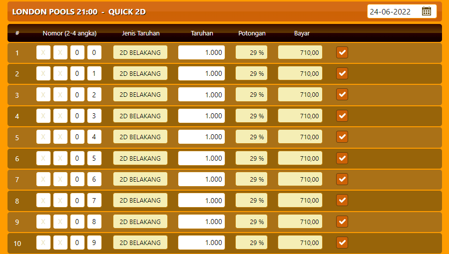 Taruhan 3 angka dan 2 angka otomatis terisi sesuai dengan kombinasi 4 angka yang dipilih.