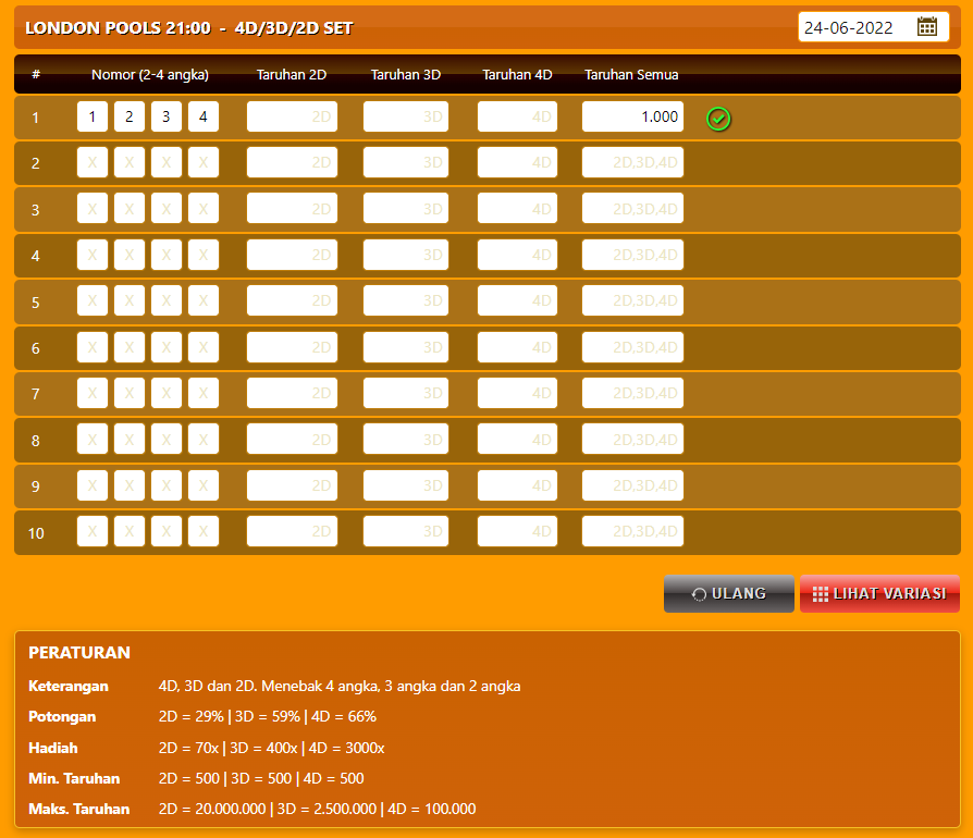Jika bertaruh pada semua pasangan (2D, 3D, dan 4D) maka bisa masukkan jumlah taruhan pada kolom semua taruhan, dan klik tombol Lihat Variasi seperti contoh pada gambar dibawah ini.