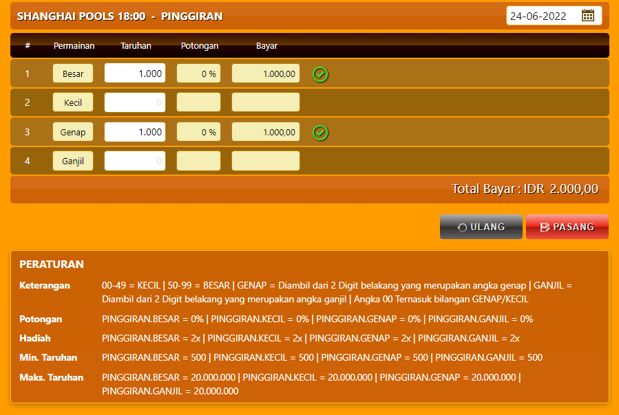 contoh : Anda memasang angka besar dan angka genap, akan keluar di jam 18:00 (shanghai pool) Dengan taruhan Rp 1.000 : tidak ada potongan harga Yang mesti angka anda yang keluar di kombinasi 4D = 2388, 1266, 4376, 3358, hadiah yang diperoleh sebesar 2x nilai taruhan. namun jika angka keluaran nya adalah 2944, maka taruhan genap dinyatakan menang sedangkan taruhan besar tersebut dinyatakan kalah.